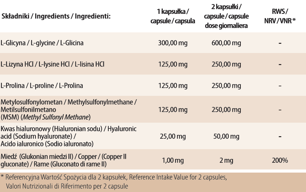 Ingredients: L-glycine, L-lysine, L-proline, methylsulfonylmethane, hydroxypropyl methylcellulose, hyaluronic acid (sodium hyaluronate), copper (copper(II) gluconate), anti-caking agent (magnesium salts of fatty acids).